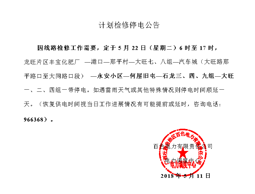 因線路檢修工作需要,定于 5 月 22 日(星期二)6 時至 17 時,龍旺片區(qū)豐寶化肥廠—港口—那平村—大旺七、八組—汽車城(大旺路那平路口至大同路口段)—永安小區(qū)—何屋舊屯—石龍三、四、九組—大旺一、二、四組一帶停電。如遇雷雨天氣或其他特殊情況則停電時間順延一天。(恢復(fù)供電時間視當(dāng)日工作進(jìn)展情況有可能提前或延時,咨詢電話:966368)。 |