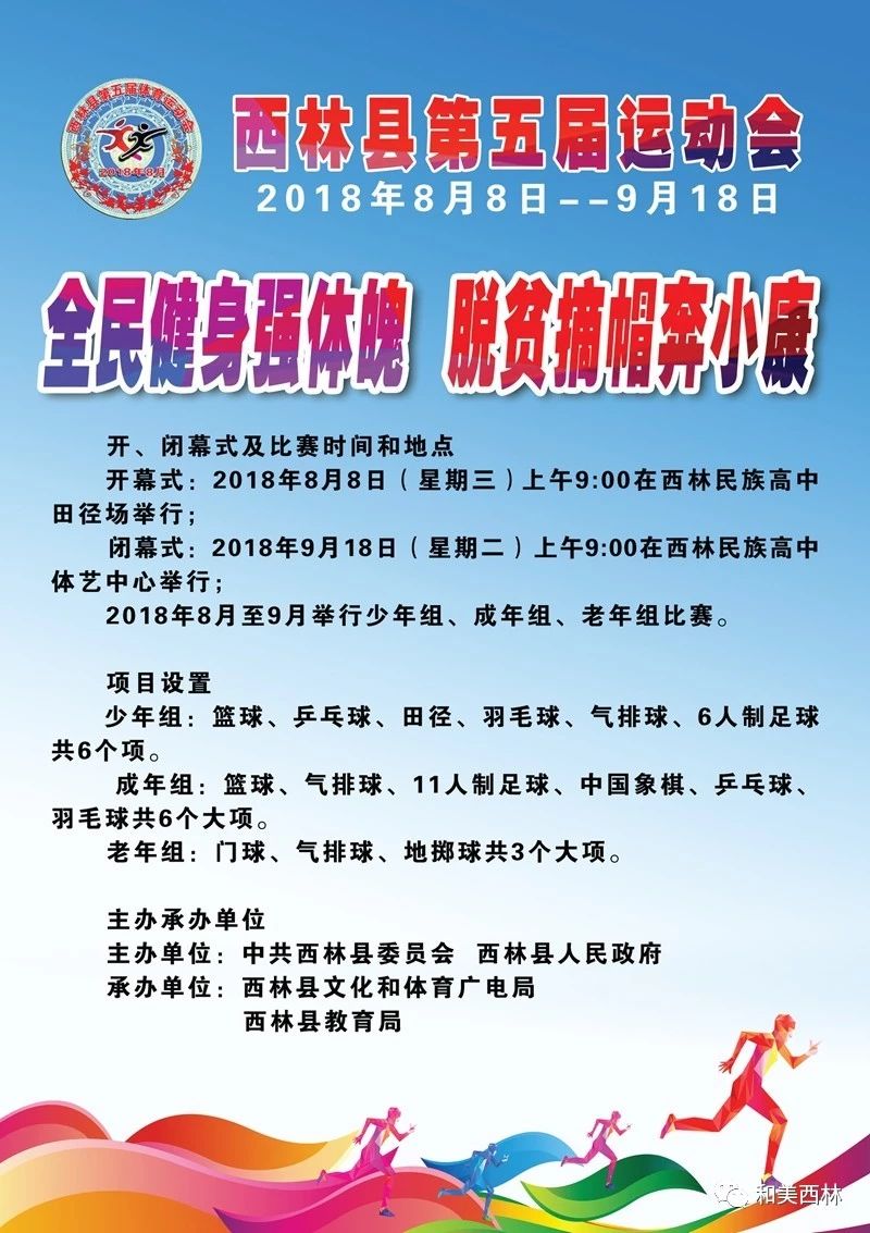 為全面貫徹黨的十九大精神,深入落實習近平總書記系列重要講話精神尤其是對體育工作重要批示指示精神,進一步推動我縣全民健身和競技體育全面發(fā)展,充分體現(xiàn)體育為民的宗旨,更好地實施體育惠民舉措,滿足廣大群眾欣賞體育賽事、參與體育健身的需求;同時為充分展示和檢驗我縣競技體育水平,發(fā)掘一批優(yōu)秀體育運動人才,提高全縣人民身體素質(zhì)和健康水平,推動全縣體育事業(yè)全面、可持續(xù)發(fā)展。縣委、縣人民政府決定舉辦西林縣第五屆運動會。