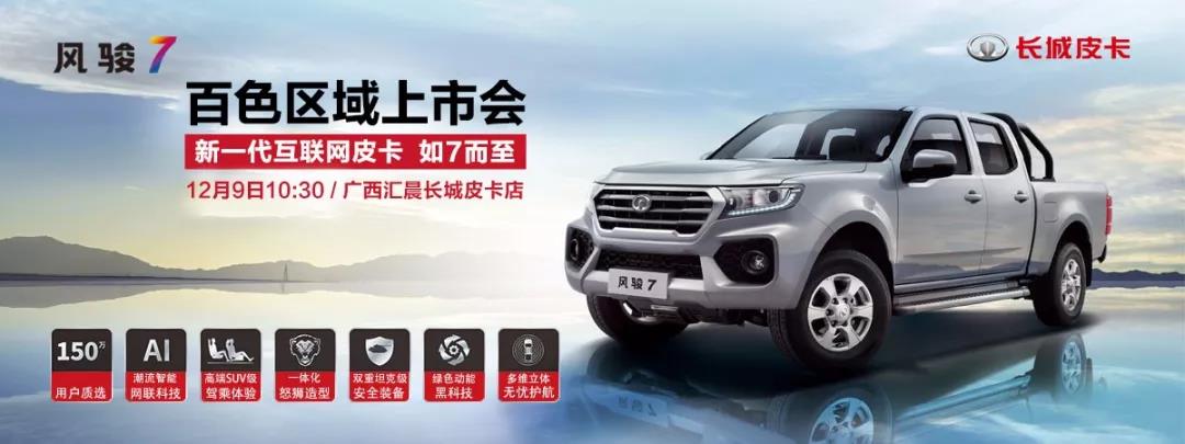 新一代互聯(lián)網皮卡 駕臨百色 新一代互聯(lián)網皮卡——風駿7,共推出8款車型,價格區(qū)間為9.58萬元~11.78萬元。風駿7在造型設計、動力、安全等配置,尤其是智能網聯(lián)技術的應用上達到全面領先,搭載全新智能語音交互系統(tǒng),打造新一代互聯(lián)網皮卡。如今,風駿7已正式駕臨百色,12月9日,百色森海誠邀您蒞臨風駿7百色區(qū)域上市會,親身品鑒,一睹“新一代互聯(lián)網皮卡”的風采。 12月9日上午10:30,廣西匯晨長城皮卡專營店, 誠邀品鑒!簽到有禮、水果點心、現(xiàn)金紅包、互動好禮…… 風駿7丨看我 送福利 風駿7 車型政策——享按揭1年0利息,最高3000元置換補貼 風駿5、風駿6 車型政策——享3000元抵6000元,按揭1年0利息 風駿7丨看我 展風采 |