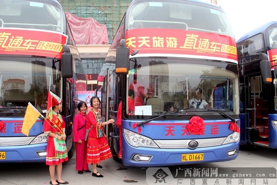 4月30日,百色旅游直通車首發(fā)儀式在百色市高鐵站進(jìn)站大道南大世紀(jì)廣場(chǎng)舉行。記者從百色市旅游發(fā)展委員會(huì)了解到,從4月30日起,游客可以在百色城區(qū)乘車直達(dá)大王嶺、田州古城、通靈大峽谷、舊州、鵝泉、樂業(yè)大石圍天坑等景區(qū)。 首發(fā)儀式當(dāng)天,100多名游客坐上直通車,直達(dá)旅游景區(qū)門口!奥糜沃蓖ㄜ噷>開通對(duì)游客來(lái)說(shuō)非常有利,我們一下高鐵就可以乘車到達(dá)景區(qū),省去了轉(zhuǎn)車、找路的麻煩!崩"五一"假期到百色旅游的游客黃雷說(shuō)。據(jù)了解,旅游專線直通車開通后,將進(jìn)一步完善百色旅游公共服務(wù)功能,改善百色旅游交通條件,為游客提供便捷的旅游交通服務(wù)。 |