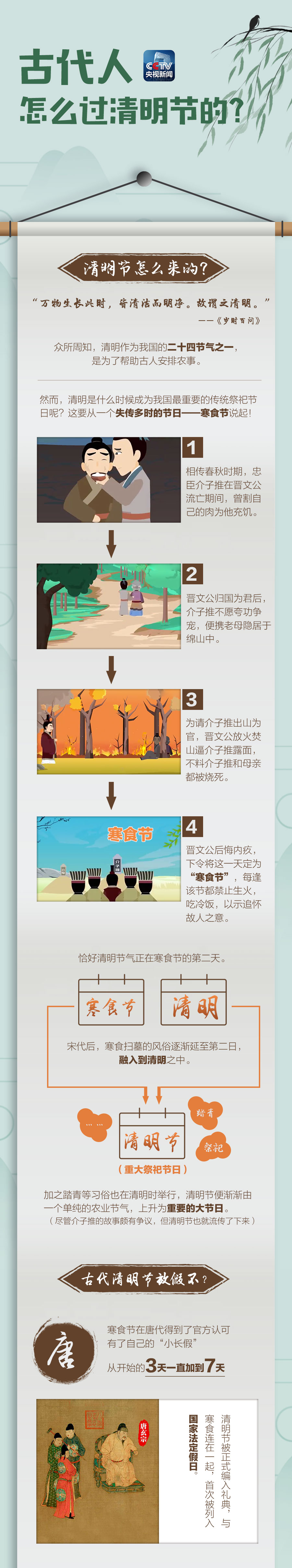 “清明時(shí)節(jié)雨紛紛,路上行人欲斷魂!碧拼(shī)人杜牧的《清明》似乎給清明節(jié)繪了一筆傷感的基調(diào)。提起清明節(jié),很多人首先想到的是掃墓祭祖,緬懷故人。 其實(shí)在古代,清明節(jié)除了有祭奠逝者的悲傷,還有萬(wàn)眾踏青、郊游、戴柳、斗雞等多種活動(dòng)。那么,你可知道清明節(jié)是怎么來(lái)的?古人在清明節(jié)可有假期?他們是怎么過(guò)的?一圖了解↓ 放眼古今,盡管清明的含義不斷變化和豐富,但清明作為一個(gè)文化符號(hào),卻早已根植進(jìn)了中國(guó)人的內(nèi)心。無(wú)論是孩童老人,還是鄉(xiāng)人游子,每當(dāng)清明時(shí)節(jié),少不了的,永遠(yuǎn)是對(duì)先賢或英烈,無(wú)盡的緬懷和思念。 這就是清明, 一個(gè)農(nóng)歷的節(jié)氣, 一種情感的寄托, 一份文化的傳承。 一炷香,一叩首間, 中華文化最純?nèi)坏膬?nèi)核, 就這樣得到了堅(jiān)守與傳承。 ▌本文綜合自:央視新聞、人民日?qǐng)?bào)、中國(guó)網(wǎng)、北京晚報(bào)、王弘力《中國(guó)古代風(fēng)俗百圖》、大話熹游·清明 監(jiān)制/楊繼紅 主編/張?zhí)煊?br> 編輯/李婷婷 陶靜怡 ©央視新聞 |
