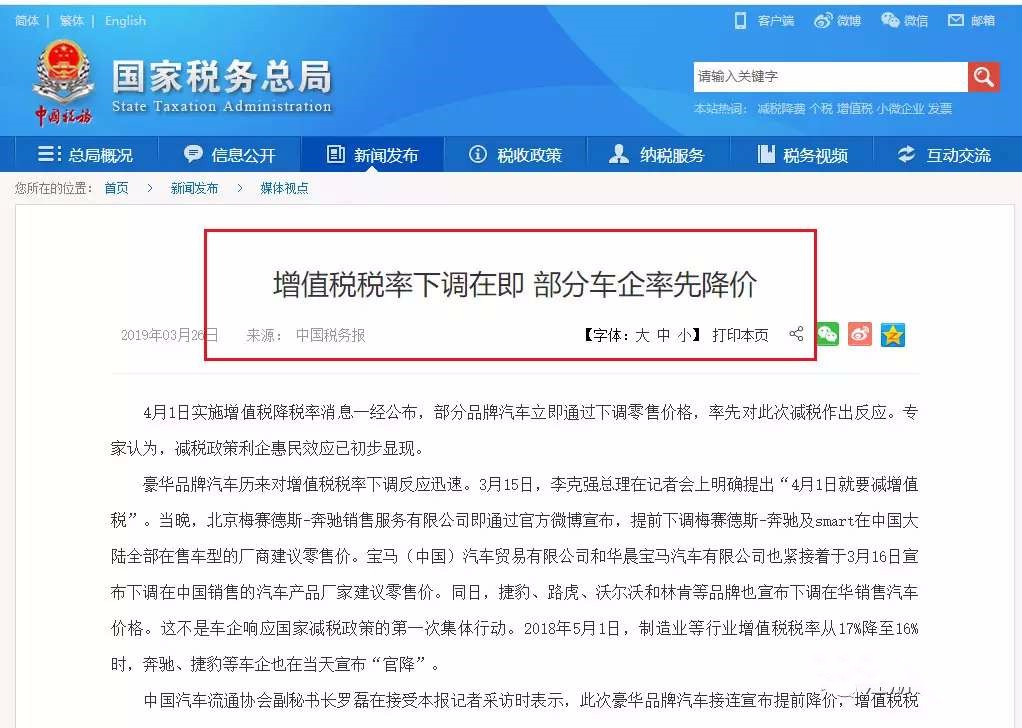 3月5日,政府工作報告宣布深化增值稅改革,今年將制造業(yè)等行業(yè)現(xiàn)行16%的稅率降至13%,該政策于今年4月1日正式實施。 近日,國家稅務(wù)總局官網(wǎng)上公布一則消息:部分品牌汽車立即通過下調(diào)零售價格,率先對此次減稅作出反應(yīng),減稅政策利企惠民效應(yīng)已初步顯現(xiàn)。 1 增值稅下調(diào)3%,車企官降 沒買車的恭喜了! 3月15日,總理在記者會上明確提出“4月1日就要減增值稅”。當(dāng)晚,北京梅賽德斯-奔馳銷售服務(wù)有限公司即通過官方微博宣布,提前下調(diào)梅賽德斯-奔馳及smart在中國大陸全部在售車型的廠商建議零售價。寶馬(中國)汽車貿(mào)易有限公司和華晨寶馬汽車有限公司也緊接著于3月16日宣布下調(diào)在中國銷售的汽車產(chǎn)品廠家建議零售價。同日,捷豹、路虎、沃爾沃和林肯等品牌也宣布下調(diào)在華銷售汽車價格。這不是車企響應(yīng)國家減稅政策的第一次集體行動。2018年5月1日,制造業(yè)等行業(yè)增值稅稅率從17%降至16%時,奔馳、捷豹等車企也在當(dāng)天宣布“官降”。 我們來看下此次降價的都有哪些車子: ![]() 來源:界面新聞、數(shù)據(jù)線 增值稅下調(diào)三個點,車價能降多少?以捷豹XFL精英版為例,調(diào)價前官方指導(dǎo)價41.58萬元,在非含稅價不變的情況下,增值稅由16%下調(diào)至13%,則該車型含稅價的下調(diào)幅度約為2.59%。 在此次下調(diào)價格的89款車型中,超5成(48款)的降價幅度低于2.59%。另有四成(39款)降價幅度高于2.59%。 ![]() ![]() 來源:界面新聞、數(shù)據(jù)線 2 增值稅憑什么影響豪車價格? 增值稅,是以商品(含應(yīng)稅勞務(wù))在流轉(zhuǎn)過程中產(chǎn)生的增值額作為計稅依據(jù)而征收的一種流轉(zhuǎn)稅。 增值稅是價外稅,采取稅款抵扣制度,稅款隨著商品流通而轉(zhuǎn)移,會計上體現(xiàn)為終端消費者承擔(dān)所有稅款。消費者在購買汽車時,發(fā)票上寫得很清楚,價格多少,稅多少,價稅合計多少,這其中的稅,指的就是增值稅。增值稅稅率下調(diào),可以說是直接減輕了消費者的負擔(dān)。 增值稅是中國最主要的稅種之一,也是最大的稅種。簡單點理解,買車時的官方指導(dǎo)價就已經(jīng)是包含增值稅的價格。 明白增值稅的含義后,就能很好解釋最近各大汽車品牌都官降的緣由了:稅率降低,車企生產(chǎn)成本隨之下降,汽車官方指導(dǎo)價自然也降低。2018年5月1日起,增值稅率已從17%下調(diào)至16%,2019年4月1日起再次下調(diào)至13%。 汽車行業(yè)是受此次增值稅降稅率政策影響較大的行業(yè),特別是對售價高、需求彈性強的豪華品牌汽車而言,這種影響尤為明顯。所以每逢增值稅稅率降低,車企的反應(yīng)最大! 經(jīng)過測算,增值稅稅率降低3%,10萬的車在理想情況下可以降2500元! 增值稅稅率降低到13%后 減少的稅額為 868207*(16%-13%)=2586! 增值稅降稅率是否會帶動某類商品降價,具體會降價多少,是由該類商品的市場競爭程度和相關(guān)企業(yè)品牌影響力決定的。但此次增值稅降稅率無疑為企業(yè)提供了降價空間,可以預(yù)計,將會有更多的企業(yè)、更多的商品加入到降價的行列中來。 3 增值稅下調(diào) 對我們的錢袋子有什么影響? 其實,增值稅下調(diào)的影響不僅僅是買車,也不僅僅對企業(yè)有影響,更對我們生活的很多方面都有影響,很多商品的價格都將降低。具體的影響:r> ![]() ![]() |