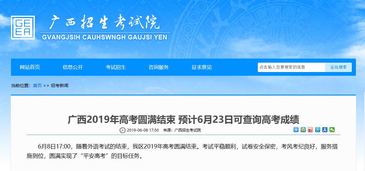 6月8日17:00,隨著外語考試的結(jié)束,我區(qū)2019年高考圓滿結(jié)束。考試平穩(wěn)順利,試卷安全保密,考風(fēng)考紀(jì)良好,服務(wù)措施到位,圓滿實(shí)現(xiàn)了“平安高考”的目標(biāo)任務(wù)。 預(yù)計(jì)6月23日可查詢高考成績 廣西招生考試院將于6月9日起組織高考評(píng)卷工作,預(yù)計(jì)6月23日對(duì)考生開放高考成績查詢通道,并公布錄取最低控制分?jǐn)?shù)線。屆時(shí)考生可查詢高考成績,請(qǐng)考生密切關(guān)注廣西招生考試院官網(wǎng)(http://www.gxeea.cn)、官方微博、官方微信發(fā)布的信息,以便及時(shí)了解最新情況。 預(yù)計(jì)6月24日可填報(bào)高考志愿 今年高考招生計(jì)劃編制工作正在審核中,預(yù)計(jì)6月24日至28日,廣西招生考試院將開通志愿填報(bào)系統(tǒng),考生將可以進(jìn)行本科提前批、高職高專提前批志愿填報(bào)。 6月25日至26日舉辦招生咨詢會(huì) 廣西招生考試院將于6月25日至26日在南寧國際會(huì)展中心舉辦廣西2019年普通高校招生咨詢會(huì),屆時(shí)將有區(qū)內(nèi)外數(shù)百所高校參加招生宣傳,廣西招生考試院也將在現(xiàn)場接受考生和家長有關(guān)招生錄取政策的咨詢,為考生填報(bào)志愿答疑解惑?忌图议L可根據(jù)各自需要自愿參加咨詢。 溫馨提示廣大考生家長 廣西招生考試院提醒考生,高考過后應(yīng)注意調(diào)節(jié)心情,適度放松,外出游玩時(shí)要注意人身安全。在考后放松的同時(shí),考生也應(yīng)提前了解我區(qū)今年普通高等學(xué)校招生錄取的相關(guān)規(guī)定,熟悉志愿填報(bào)和投檔錄取相關(guān)政策、流程,以及各高校招生章程,為填報(bào)志愿做好充分準(zhǔn)備。在此期間,社會(huì)一些不法分子可能利用考生和家長們迫切知曉高考成績及希望上好大學(xué)的心理進(jìn)行招生詐騙,請(qǐng)考生和家長提高警惕,謹(jǐn)防上當(dāng)受騙。 |
