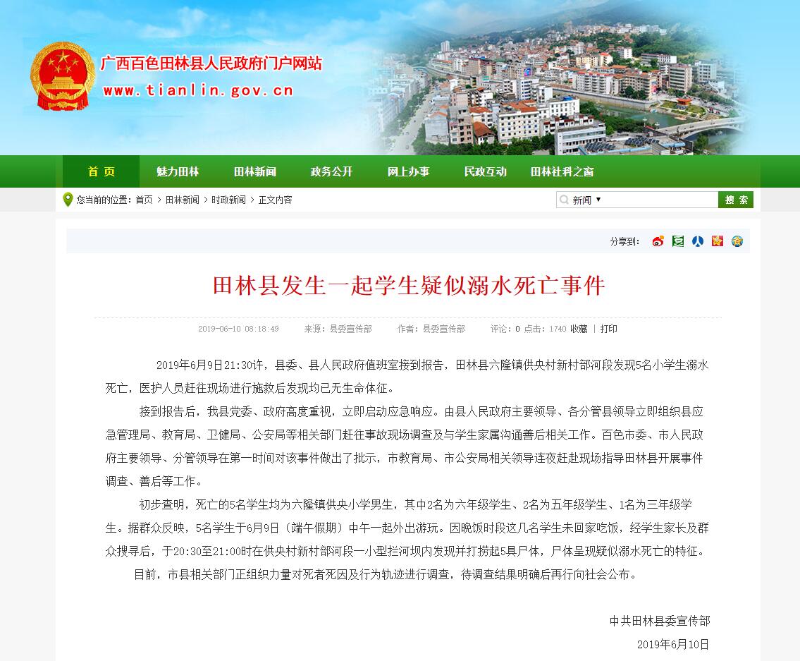 6月9日21:30許,田林縣六隆鎮(zhèn)供央村新村部河段發(fā)現(xiàn)5名小學生溺水死亡,醫(yī)護人員趕往現(xiàn)場進行施救后發(fā)現(xiàn)均已無生命體征。 初步查明,死亡的5名學生均為六隆鎮(zhèn)供央小學男生,其中2名為六年級學生、2名為五年級學生、1名為三年級學生。據(jù)群眾反映,5名學生于6月9日(端午假期)中午一起外出游玩。因晚飯時段這幾名學生未回家吃飯,經(jīng)學生家長及群眾搜尋后,于20:30至21:00時在供央村新村部河段一小型攔河壩內(nèi)發(fā)現(xiàn)并打撈起5具尸體,尸體呈現(xiàn)疑似溺水死亡的特征。 目前,市縣相關(guān)部門正組織力量對死者死因及行為軌跡進行調(diào)查,待調(diào)查結(jié)果明確后再行向社會公布。 (田林縣人民政府網(wǎng)站截圖) |