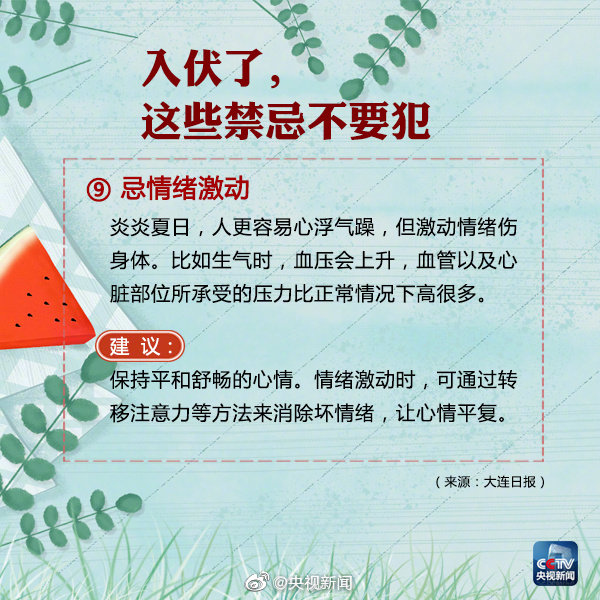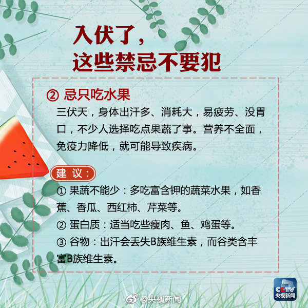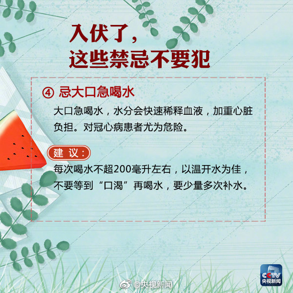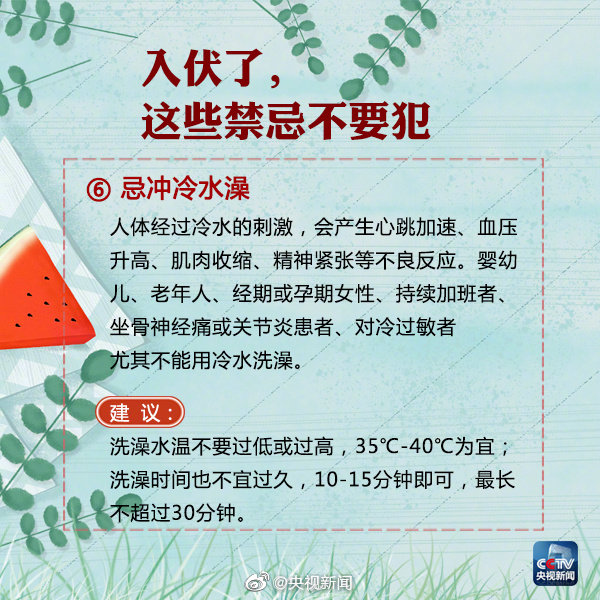 今年的“三伏天”,7月12日至7月21日為“初伏”,7月22日至8月10日為“中伏”,8月11日至8月20日為“末伏”,共計40天。 按農歷計算,每年夏至后的第三個庚日入伏,立秋后的第二個庚日出伏。頭伏和末伏的長度是固定的,均為10天。中伏長度則由“立秋”節(jié)氣與其后首個庚日之間的間隔決定。 因此,中伏可能是10天,也可能是20天,對應的就有30天的“普通版”三伏和40天的“豪華版”三伏。 7月12日開始進入三伏天,“三伏天”是一年中最熱的時節(jié),今年還是“40天加長版三伏天”,大家注意做好防暑降溫措施的同時,為健康,這9條禁忌不要犯! |