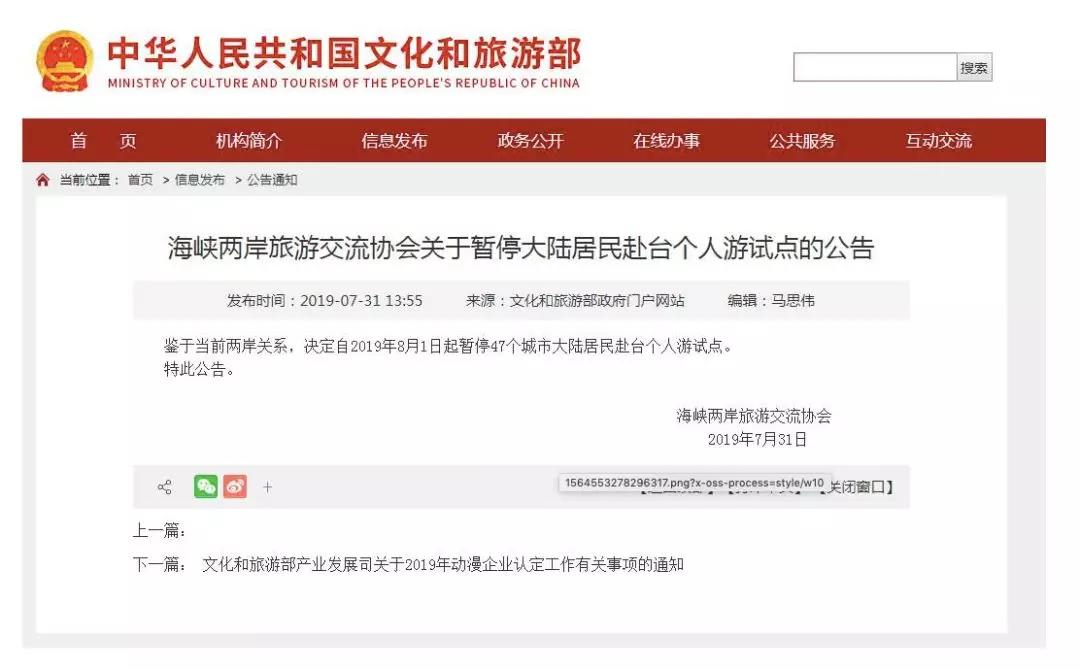 據(jù)文化和旅游部網(wǎng)站消息,海峽兩岸旅游交流協(xié)會公告稱,鑒于當(dāng)前兩岸關(guān)系,決定自2019年8月1日起暫停47個城市大陸居民赴臺個人游試點。 此前,自2011年6月28日,上海、北京、廈門三個城市率先開放赴臺自由行以來,一共開放了5批47個城市。 第一批(3個):北京、上海、廈門。 第二批(10個):天津、南京、重慶、成都、廣州、杭州、深圳、福州、濟南、西安。 第三批(13個):蘇州、武漢、寧波、青島、鄭州、沈陽、長春、石家莊、長沙、昆明、南寧、合肥、泉州。 第四批(10個):哈爾濱、太原、南昌、貴陽、大連、無錫、溫州、中山、煙臺、漳州。 第五批(11個):海口、呼和浩特、蘭州、銀川、常州、舟山、惠州、威海、龍巖、桂林、徐州。 |