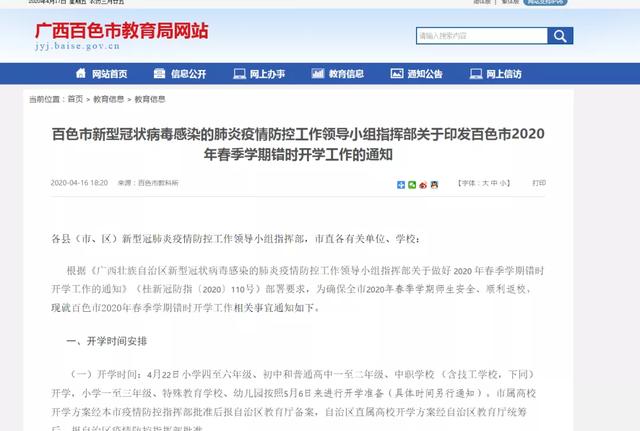 4月15日,百色市新冠肺炎疫情防控指揮部印發(fā)《百色市新型冠狀病毒感染的肺炎疫情防控工作領(lǐng)導小組指揮部關(guān)于印發(fā)百色市2020年春季學期錯時開學工作的通知》(百新冠防指辦〔2020〕75號),公布我市中小學2020年春季學期開學時間安排。 以下是通知全文: 百色市新型冠狀病毒感染的肺炎疫情防控工作領(lǐng)導小組指揮部關(guān)于印發(fā)百色市2020年春季學期錯時開學工作的通知 各縣(市、區(qū))新型冠肺炎疫情防控工作領(lǐng)導小組指揮部,市直各有關(guān)單位、學校: 根據(jù)《廣西壯族自治區(qū)新型冠狀病毒感染的肺炎疫情防控工作領(lǐng)導小組指揮部關(guān)于做好2020年春季學期錯時開學工作的通知》(桂新冠防指〔2020〕110號)部署要求,為確保全市2020年春季學期師生安全、順利返校,現(xiàn)就百色市2020年春季學期錯時開學工作相關(guān)事宜通知如下。 一、開學時間安排 (一)開學時間:4月22日小學四至六年級、初中和普通高中一至二年級、中職學校 (含技工學校,下同)開學,小學一至三年級、特殊教育學校、幼兒園按照5月6日來進行開學準備(具體時間另行通知)。市屬高校開學方案經(jīng)本市疫情防控指揮部批準后報自治區(qū)教育廳備案,自治區(qū)直屬高校開學方案經(jīng)自治區(qū)教育廳統(tǒng)籌后,報自治區(qū)疫情防控指揮部批準。 (二)返校時間:除因疫情防控要求暫不能返崗的教職工外,小學、初中、高中、中職學校全體教職員工包括行政管理人員、校醫(yī)等要在4月16日前提前返崗;寄宿制學校學生于4月21日返校。特殊教育學校、幼兒園全體教職員工于5月1日前提前返崗。 二、重點工作安排 按照自治區(qū)統(tǒng)一部署,各縣(市、區(qū))、各相關(guān)學校要認真落實自治區(qū)新冠肺炎疫情防控指揮部印發(fā)的《學校疫情防控工作“十嚴格”》《廣西中小學校新冠肺炎疫情防控實施方案》以及百色市新冠肺炎疫情防控工作領(lǐng)導小組指揮部印發(fā)的《百色市中小學(幼兒園)新冠肺炎疫情防控工作方案》等5個工作方案要求,加強校園管理和日常疫情防控,要確保師生返校后不發(fā)生疫情。師生返校工作參照《百色市2020年春季學期初三、高三年級師生返校工作方案》執(zhí)行。重點做好以下幾項工作: (一)專業(yè)培訓。小學、中職學校在4月17前,特殊教育學校、幼兒園于4月24日前對教職員工進行疫情防控、消殺規(guī)范、應(yīng)急處置等專業(yè)培訓。 (二)應(yīng)急演練。小學、中職學校在4月17日前,特殊教育學校、幼兒園于4月27日前,按照疫情防控工作方案、應(yīng)急預案、師生返校方案開展應(yīng)急演練。 (三)防疫消殺。自4月15日起至開學前,小學、中職學校至少進行2次全面的校園環(huán)境衛(wèi)生清潔和預防性消毒,初中、高中學校按常規(guī)要求進行消殺。特殊教育學校、幼兒園于開學前進行全面的校園環(huán)境衛(wèi)生清潔和預防性消毒。 (四)物資儲備。小學、初中、高中、中職各學校在4月17日前完成口罩、測溫設(shè)備、消毒液、洗手液等防疫物資儲備。 (五)返校驗收。市、縣兩級新冠肺炎疫情防控指揮部學校開學工作組分別于4月19日前、4月27日前組織對小學、中職學校和特殊教育學校、幼兒園進行驗收審批,驗收合格的學校方可組織師生返校。 (六)開學報到。各校制定開學返校工作方案,學生錯時返校,不集中報到,減少不必要的人員聚集。 三、保障工作 (一)加強組織領(lǐng)導。各縣(市、區(qū))黨委政府要落實屬地管理責任,加強組織協(xié)調(diào)。 (二)落實部門職責。各部門要圍繞確保師生開學安全的目標,積極落實防控各項工作。 (三)健全督查機制。各級教育、衛(wèi)生健康、公安、交通運輸、市場監(jiān)管等部門要成立開學工作督導組,對各地各學校疫情防控工作和開學準備工作情況進行全面檢查。市級開學工作督導組要對每個縣(市、區(qū))進行檢查,各縣(市、區(qū))要對每所學校進行檢查,發(fā)現(xiàn)問題要立即整改,未達到開學條件的學校不得開學。 幼兒園開學時間以官方信息為準。 百色市新冠肺炎疫情防控工作 領(lǐng)導小組指揮部 2020年4月15日 來源 | 百色市新冠肺炎疫情防控工作領(lǐng)導小組指揮部百色政法 |