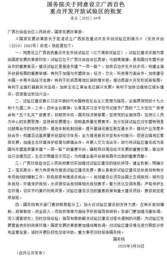 據中國政府網4月7日消息,國務院發(fā)布關于同意設立廣西百色重點開發(fā)開放試驗區(qū)的批復。批復指出,要努力將試驗區(qū)建設成為我國與東盟高質量共建“一帶一路”的重要平臺、輻射帶動周邊經濟發(fā)展的重要引擎、穩(wěn)邊安邊興邊模范區(qū)、生態(tài)文明建設示范區(qū),為構建全面開放新格局作出新的重要貢獻。