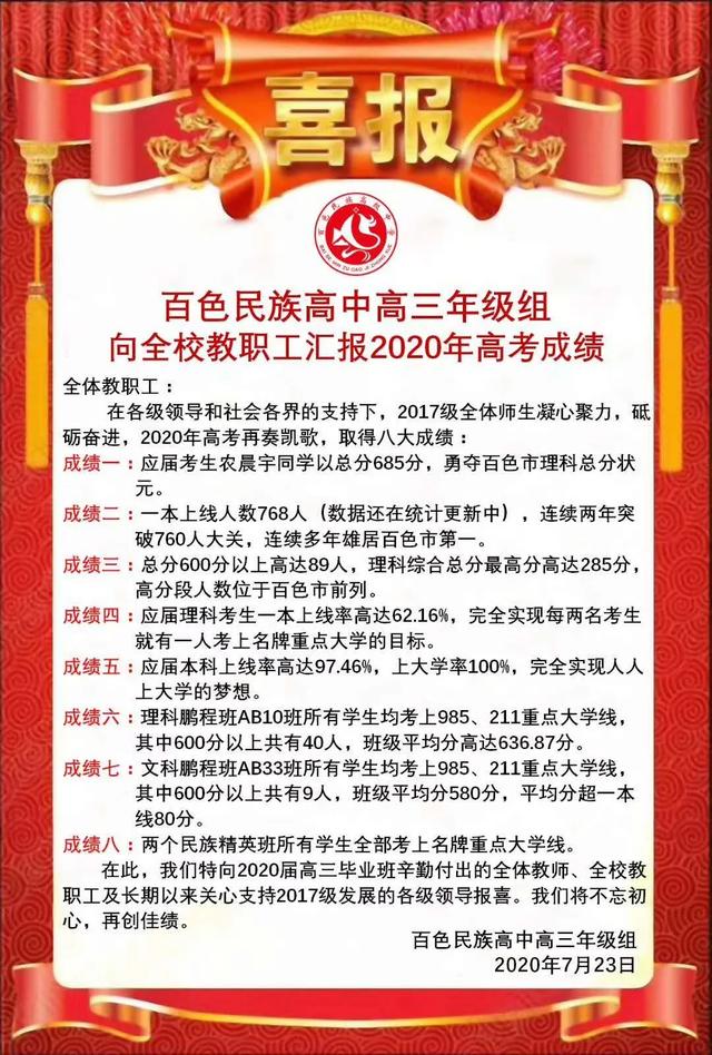 2020年百色民族高中高考成績(jī)喜報(bào)