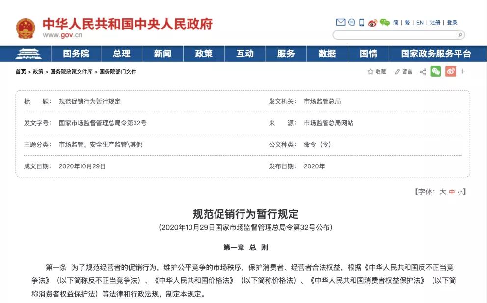 11月5日,市場(chǎng)監(jiān)管總局公布《規(guī)范促銷行為暫行規(guī)定》,其中規(guī)定經(jīng)營(yíng)者折價(jià)、減價(jià),應(yīng)當(dāng)標(biāo)明或者通過(guò)其他方便消費(fèi)者認(rèn)知的方式表明折價(jià)、減價(jià)的基準(zhǔn)。通過(guò)積分、禮券、兌換券、代金券等折抵價(jià)款的,應(yīng)當(dāng)以顯著方式標(biāo)明或者通過(guò)店堂告示等方式公開(kāi)折價(jià)計(jì)算的具體辦法。
