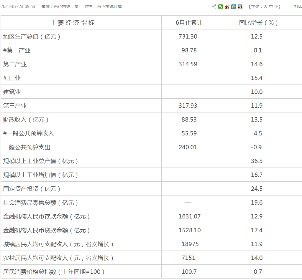 2021年7月23日,百色市統(tǒng)計(jì)局、國(guó)家統(tǒng)計(jì)局百色調(diào)查隊(duì)聯(lián)合公布百色市2021年上半年經(jīng)濟(jì)發(fā)展數(shù)據(jù)。 上半年,全市上下堅(jiān)決貫徹落實(shí)中央“六穩(wěn)”、“六!睕Q策部署,“奮戰(zhàn)一季度、加力開新局,進(jìn)擋加油再提速、全力攻堅(jiān)二季度”,克難攻堅(jiān),奮力前行,全市經(jīng)濟(jì)持續(xù)穩(wěn)定恢復(fù),主要指標(biāo)較快增長(zhǎng),總體上實(shí)現(xiàn)預(yù)期目標(biāo),質(zhì)量效益進(jìn)一步提高,經(jīng)濟(jì)呈現(xiàn)穩(wěn)中加固的發(fā)展態(tài)勢(shì)。 根據(jù)地區(qū)生產(chǎn)總值統(tǒng)一核算結(jié)果,上半年百色市地區(qū)生產(chǎn)總值731.30億元,按可比價(jià)計(jì)算,同比增長(zhǎng)12.5%,增速比一季度回落2.7個(gè)百分點(diǎn);兩年平均增長(zhǎng)8.7%。 分產(chǎn)業(yè)看,第一產(chǎn)業(yè)增加值98.78億元,同比增長(zhǎng)8.1%,兩年平均增長(zhǎng)6.4%;第二產(chǎn)業(yè)增加值314.59億元,同比增長(zhǎng)14.6%,兩年平均增長(zhǎng)10.0%;第三產(chǎn)業(yè)增加值317.93億元,同比增長(zhǎng)11.9%,兩年平均增長(zhǎng)8.2%。 一、農(nóng)業(yè)經(jīng)濟(jì)提質(zhì)增效,生豬產(chǎn)能顯著恢復(fù) 上半年,全市農(nóng)林牧漁業(yè)總產(chǎn)值同比增長(zhǎng)10.5%,增速比一季度提高0.9個(gè)百分點(diǎn),兩年平均增長(zhǎng)7.6%。農(nóng)、林、牧、漁業(yè)總產(chǎn)值分別增長(zhǎng)8.3%、15.9%、14.6%和下降15.1%。上半年,全市水果產(chǎn)量同比增長(zhǎng)15.1%,其中芒果增長(zhǎng)14.6%;蔬菜(含食用菌)產(chǎn)量增長(zhǎng)6.7%;全社會(huì)竹木采伐量增長(zhǎng)21.3%;生豬出欄達(dá)105.16萬頭,增長(zhǎng)22.0%,生豬存欄122.36萬頭,同比增長(zhǎng)17.9%;水產(chǎn)品產(chǎn)量下降12.2%。 二、工業(yè)經(jīng)濟(jì)穩(wěn)步增長(zhǎng),主要產(chǎn)品產(chǎn)量增勢(shì)良好 上半年,全市規(guī)模以上工業(yè)增加值同比增長(zhǎng)16.7%,兩年平均增長(zhǎng)11.1%。其中,6月份規(guī)模以上工業(yè)增加值同比增長(zhǎng)21.4%。分經(jīng)濟(jì)類型看,國(guó)有企業(yè)增加值同比增長(zhǎng) 9.4%,股份制企業(yè)同比增長(zhǎng) 17.1%,外商及港澳臺(tái)商投資企業(yè)同比增長(zhǎng)20.0%。分三大門類看,采礦業(yè)增加值同比下降15.7%,兩年平均下降21.0%;制造業(yè)同比增長(zhǎng)19.0%,兩年平均增長(zhǎng)12.6%;電力、熱力、燃?xì)饧八a(chǎn)和供應(yīng)業(yè)同比增長(zhǎng)12.5%,兩年平均增長(zhǎng)11.9%。主要行業(yè)較快增長(zhǎng)。有色金屬冶煉和壓延加工業(yè)增加值同比增長(zhǎng)16.3%,電力、熱力生產(chǎn)和供應(yīng)業(yè)增加值同比增長(zhǎng)12.6%,黑色金屬冶煉和壓延加工業(yè)增加值同比增長(zhǎng)18.0%,非金屬礦物制品業(yè)增加值同比增長(zhǎng)37.0%,木材加工和木、竹、藤、棕、草制品業(yè)增加值同比增長(zhǎng)15.7%,農(nóng)副食品加工業(yè)增加值同比增長(zhǎng)27.7%,計(jì)算機(jī)、通信和其他電子設(shè)備制造業(yè)增加值同比增長(zhǎng)649.3%。從產(chǎn)品產(chǎn)量看,氧化鋁增長(zhǎng)4.4%;電解鋁增長(zhǎng)16.7%;鋁材增33.9%;二氧化錳增長(zhǎng)17%;石墨及炭素制品增長(zhǎng)9.3%;燒堿增長(zhǎng)12.9%;水泥增長(zhǎng)56.9%;硅酸鹽水泥熟料增長(zhǎng)17.2%;石灰增長(zhǎng)36.2%;商品混凝土增長(zhǎng)20.6%;鐵合金增長(zhǎng)25.4%;人造板增長(zhǎng)54.9%;機(jī)制紙及紙板增長(zhǎng)38.4%、鋸材增長(zhǎng)9.0%。 1-5月,全市規(guī)模以上工業(yè)企業(yè)實(shí)現(xiàn)營(yíng)業(yè)收入561.74億元,同比增長(zhǎng)37.4%;實(shí)現(xiàn)利潤(rùn)總額42.31億元,同比增長(zhǎng)4.8倍;虧損企業(yè)125家,減少25家,虧損企業(yè)虧損額6.24億元,同比下降30.2%;企業(yè)產(chǎn)成品存貨周轉(zhuǎn)天數(shù)8.6天,同比減少3.4天。 三、服務(wù)業(yè)穩(wěn)健復(fù)蘇,娛樂行業(yè)快速增長(zhǎng) 上半年,全市第三產(chǎn)業(yè)增加值同比增長(zhǎng)11.9%,兩年平均增長(zhǎng)8.2%。鐵路客貨運(yùn)輸周轉(zhuǎn)量、公路客貨運(yùn)輸周轉(zhuǎn)量、水路客貨運(yùn)輸周轉(zhuǎn)量、航空客貨運(yùn)輸周轉(zhuǎn)量分別同比增長(zhǎng)17.9%、38.0%、25.7%、43.6%,其中鐵路、航空客貨運(yùn)輸周轉(zhuǎn)量增速分別比一季度提高4.1、21.4個(gè)百分點(diǎn)。1-5月份,全市規(guī)模以上服務(wù)業(yè)企業(yè)營(yíng)業(yè)收入同比增長(zhǎng)16.3%,兩年平均增長(zhǎng)8.4%。其中規(guī)模以上其他營(yíng)利性服務(wù)業(yè)營(yíng)業(yè)收入同比增長(zhǎng)29.4%,兩年平均增長(zhǎng)23.3%,娛樂業(yè)和軟件和信息技術(shù)服務(wù)業(yè)分別增長(zhǎng)5.0倍、1.5倍。 四、市場(chǎng)銷售穩(wěn)步回暖,汽車類銷售持續(xù)增長(zhǎng) 上半年,全市社會(huì)消費(fèi)品零售總額同比增長(zhǎng)19.6%,兩年平均增長(zhǎng)5.7%。限額以上消費(fèi)品零售額同比增長(zhǎng)15.0%,比2019年上半年下降0.5%,兩年平均下降1.0%。按經(jīng)營(yíng)單位所在地分,城鎮(zhèn)消費(fèi)品零售額同比增長(zhǎng)19.1%,兩年平均增長(zhǎng)6.2%;鄉(xiāng)村消費(fèi)品零售額同比增長(zhǎng)21.4%,兩年平均下降0.4%。按消費(fèi)類型分,餐飲收入同比增長(zhǎng)62.9%,兩年平均增長(zhǎng)9.3%;商品零售同比增長(zhǎng)17.1%,兩年平均增長(zhǎng)5.5%。從商品類別看,上半年限上單位