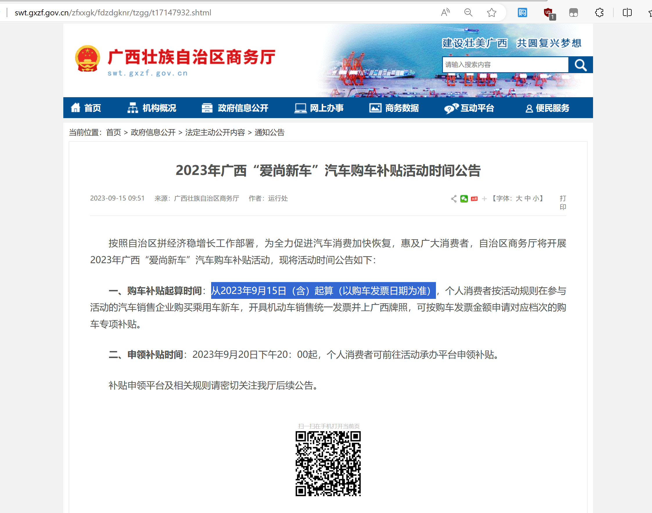 按照自治區(qū)拼經(jīng)濟(jì)穩(wěn)增長工作部署,為全力促進(jìn)汽車消費(fèi)加快恢復(fù),惠及廣大消費(fèi)者,自治區(qū)商務(wù)廳將開展2023年廣西“愛尚新車”汽車購車補(bǔ)貼活動(dòng),現(xiàn)將活動(dòng)時(shí)間公告如下: 一、購車補(bǔ)貼起算時(shí)間:從2023年9月15日(含)起算(以購車發(fā)票日期為準(zhǔn)),個(gè)人消費(fèi)者按活動(dòng)規(guī)則在參與活動(dòng)的汽車銷售企業(yè)購買乘用車新車,開具機(jī)動(dòng)車銷售統(tǒng)一發(fā)票并上廣西牌照,可按購車發(fā)票金額申請(qǐng)對(duì)應(yīng)檔次的購車專項(xiàng)補(bǔ)貼。 二、申領(lǐng)補(bǔ)貼時(shí)間:2023年9月20日下午20:00起,個(gè)人消費(fèi)者可前往活動(dòng)承辦平臺(tái)申領(lǐng)補(bǔ)貼。 補(bǔ)貼申領(lǐng)平臺(tái)及相關(guān)規(guī)則請(qǐng)密切關(guān)注我廳后續(xù)公告。 來源:廣西壯族自治區(qū)商務(wù)廳 |