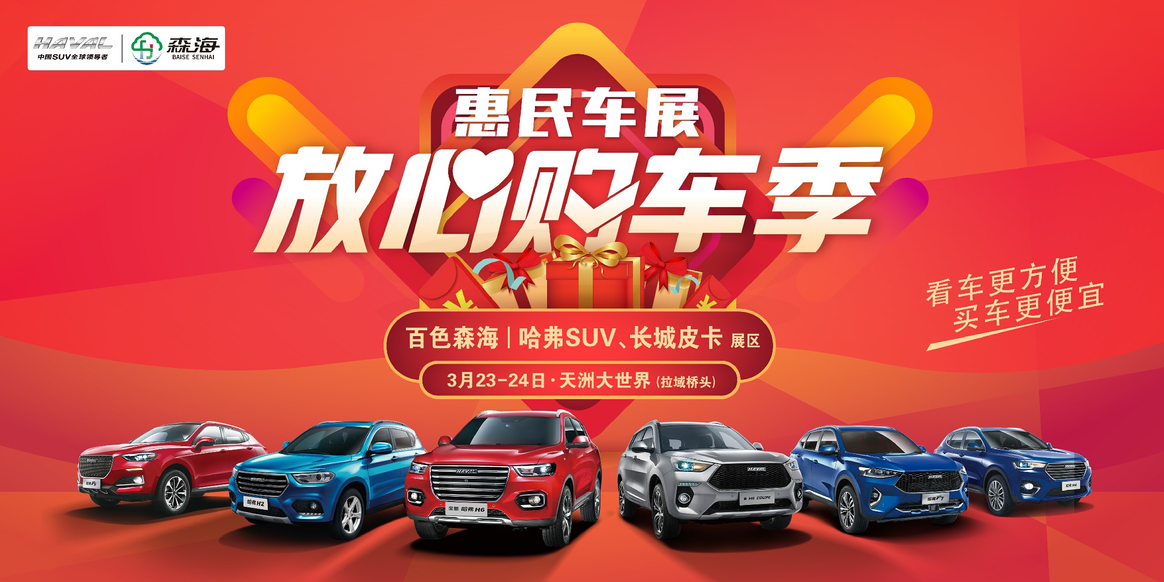 百色第四屆惠民車展 3月23-24日,天洲大世界 百色森海 哈弗SUV、長城皮卡 品牌 誠邀您蒞臨,給您放心價 這個購車季,瘋狂底價購